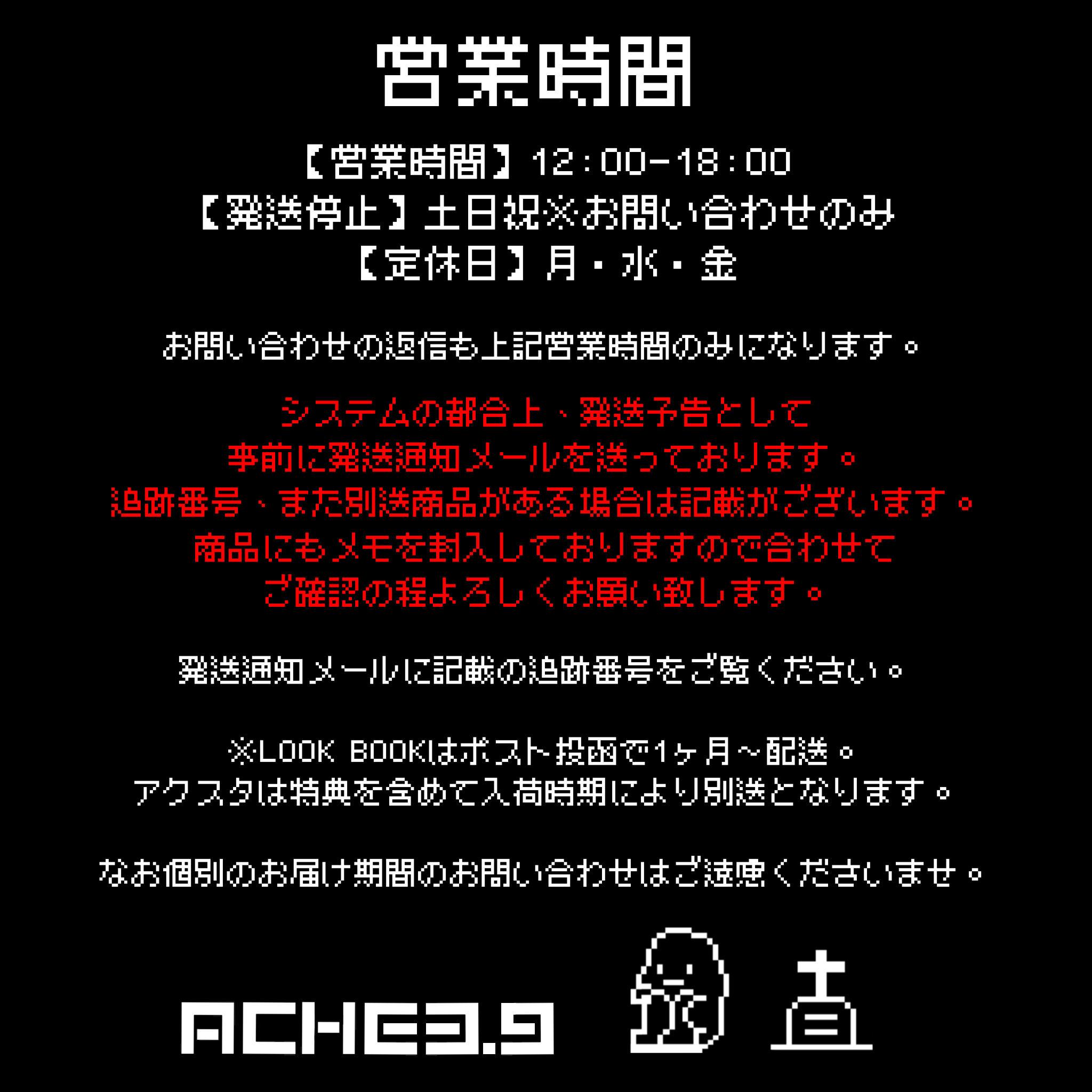 この度はウェブショップをご覧いただきありがとうございます。 トラブル防止のため、こちらをご一読の上ご購入お願いいたします。 ▼営業時間▼ 定休日 土日祝日、また年末年始 ポップアップ開催中と同様に休業致します。 発送と問い合わせ 12:00〜17:00 ▼購入につきまして▼ ①購入後の返品、交換 不良品に限ります。受注生産の商品は作り直しで対応致しますので入金後のキャンセルはいかなる理由でも承れません。 返品、交換希望の方はお手数ですが[email protected]までお問い合わせください。(SNSでお問い合わせいただいてもお返事致しかねます。) ▶︎受注商品 入金後に生産しているため返品不可となっております。ご了承の上ご購入ください。 またキャンセル期限の関係で発送予定日を事前にメールにて送付する場合もございます。 お届けまで1ヶ月以上お時間をいただく場合がございます。 イメージが違う、早く受け取りたかった等のお客様都合の返品もお断りしております。 返品、交換の可能な商品は明らかな欠陥があるもの、購入後1週間以内で未使用に限ります。 受け取り後1週間をすぎた商品につきましては保証対象外です。 返金については原則【交換が不可能なもの】に限ります。特典チェキやおまけなど、金銭が発生していないものは対象外となりますのでご注意ください。 ▶︎特典につきまして 配送事故などが発生した場合、特典チェキやアクリルスタンドは保証可能ですが 先着のメッセージカード等保証できないものに関しては対応できかねます。 また先着のカードはモデル様のご厚意でご用意しているもののため何人まで等の質問などはお答えできません。 ▶︎配送につきまして◀︎ 原則送料無料です。 そのため送料は最短でお届けできる配送方法をこちらで選んでいます。 梱包材の費用なども含まれておりますので送料の差額の返金はできません。 受注商品は工場から直送となるため送料のおまとめはできかねます。 営業所止め、郵便局止めはお断りいたしております。 また日付指定や時間指定も原則お断りしていますのでご理解くださいませ。 また、お客様自身の過失(住所間違い)等でこちらへ商品が戻ってきた場合、メールかSMSにてご連絡差し上げます。 商品保管期間はご連絡から1ヶ月内とし、その期間に再配達料を決済されなかった場合はキャンセル扱いとなり返金、並びに発送はできかねます。 発送完了メール、または事前配送告知メールに記載されている発送予定日からから2週間経っても届かない場合はお問い合わせくださいませ。 注文内容に不備がございましたら発送メール前までにお申し出下さい。発送後はいかなる場合対応かかねます。 近日、お名前、住所や電話番号、メールアドレスに不備がある方がみられます。 その場合、お届けできないトラブルも予測されますがこちらでは保証致しかねますので注文前に今一度ご確認ください。 ▶︎注文キャンセルにつきまして お振り込みなしのキャンセルは営業の妨げになりますので振り込みなしのキャンセルがあったお客様とのお取り引きはいかなる場合以降一切御断りさせていただきます。 ▶︎業務妨害につきまして 近年、問い合わせメール等で脅迫や暴言を送られるお客様が見受けられます。 こちらは全てのやりとりと情報を控え、必要に応じて関係各所への報告、相談等を行っております。 今後もいかなる事情があってもカスハラと見受けられる事案は許容致しませんのでご注意ください。被害が認められ次第、威力業務妨害として警察に通報致します。 ▼受注生産商品につきまして 入金確認後の生産になります。発送は直送いたしますので発送後の経過はご自身で追跡番号にて確認お願いします。 ご注文日からお届けまでは最長一ヶ月ほどお時間をいただきます。 なおショップの運営管理は全てBASE事務局様にお願いしておりますのでキャンセルや決済関連、購入後の不具合(購入メールを消してしまった等)のお問い合わせはBASE事務局までお願い致します。 ▼お支払い方法 クレジットカード決済、コンビニ決済・Pay-easy、銀行振込、後払い決済をご利用いただけます。 詳しくは→https://thebase.in/payments ▼書類の発行等について 海外代行業者の購入はお断りしております。発覚した場合はキャンセル、もしくは今後の販売をお断り致します。 あわせまして適格請求書等も対応していませんのでご了承くださいませ。
